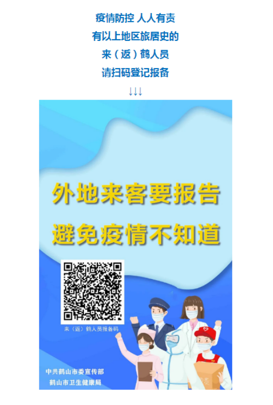 因疫情防控需要,请在排查时间内有以下地区旅居史的来(返)鹤人员迅速向所在镇(街)报备,登记离开所在地区的时间和现住址,不参加聚集性活动,不前往密闭公共场所,按照村(居)三人小组要求落实健康管理措施。