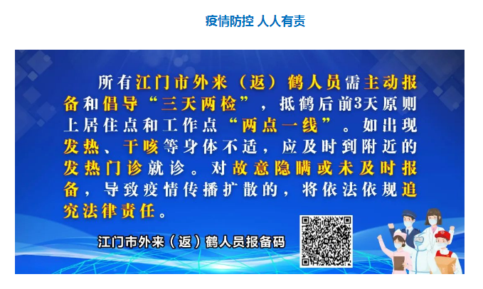 主动报备行程 江门市外返回鹤山人员,第一时间向所在镇(街)及所在单位进行报备,如未报备造成疫情扩散的,将依法追究法律责任。