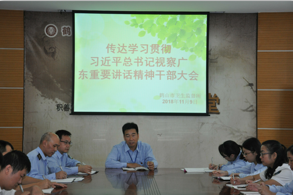 首要议程是传达贯彻省、江门、鹤山学习贯彻习近平总书记视察广东重要讲话精神。会议指出,我们要深刻认识习近平总书记视察广东重要讲话精神的重大政治意义、现实意义和深远历史意义,形成学习习近平总书记重要讲话精神的高度思想自觉和行动自觉。要深刻领悟习近平总书记视察广东重要讲话的丰富内涵和精神实质,切实以统一思想武装头脑,指导实践,引领卫生监督执法工作向更高、更好的方向发展。