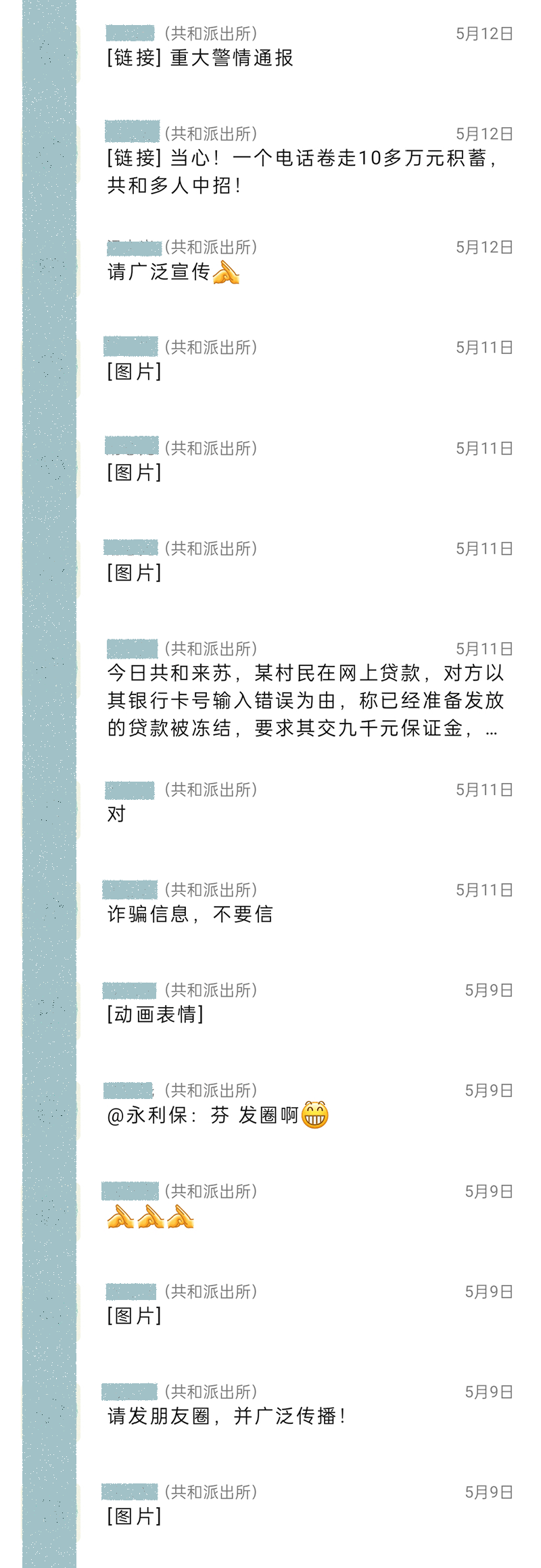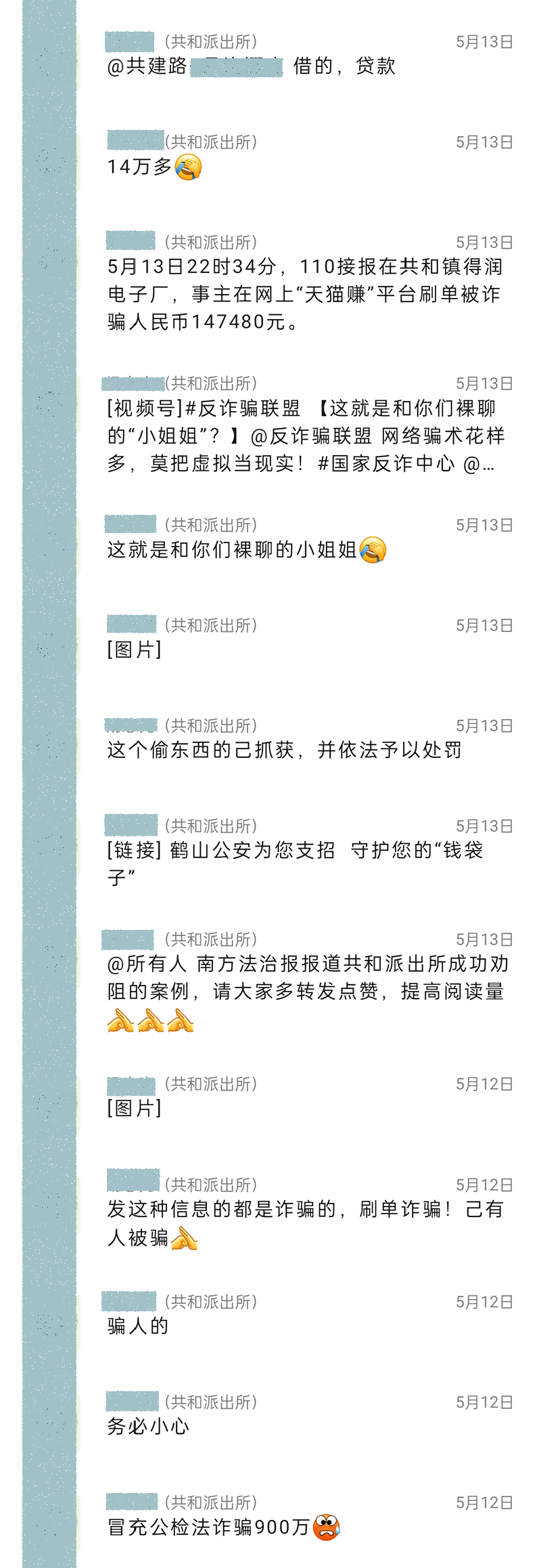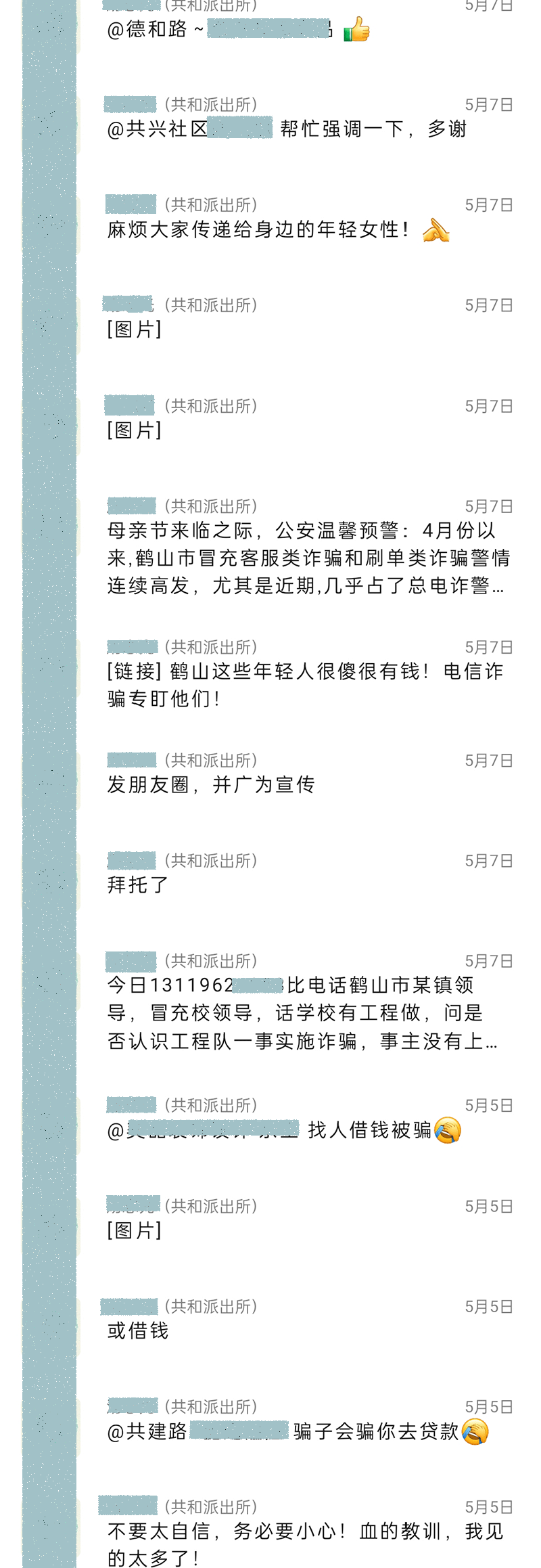 在商铺群、企业群、朋友圈等几个月每天不间断宣传反诈骗(部分截图)