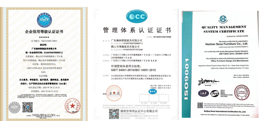 森纳公司先后通过了ISO9001:2015质量认证管理体系、ISO14001:2015环境管理体系、ISO45001:2018职业健康安全管理体系、CQC、3A信用管理体系、售后服务管理体系、ES两体系、中国环境标志(十环)认证,产品质量得到认可。