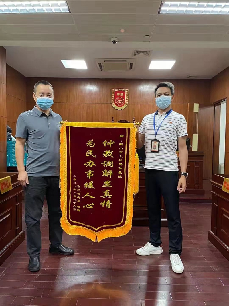 2021年8月30日下午,劳动者钱某来到市仲裁院送上一面写有“仲裁调解显真情,为民办事暖人心”锦旗,感谢市仲裁院和仲裁员张超毅用心用情调解,尽职尽责为民办实事。
