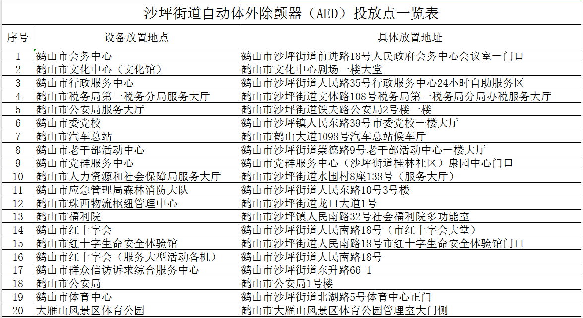 为完善我街道应急救护体系建设,提高应急救护能力,近期,鹤山市红十字会在沙坪街道越塘村委会新增投放一台自动体外除颤仪(AED)。截至目前,沙坪街道共有36台自动体外除颤仪(AED)投入服务。
