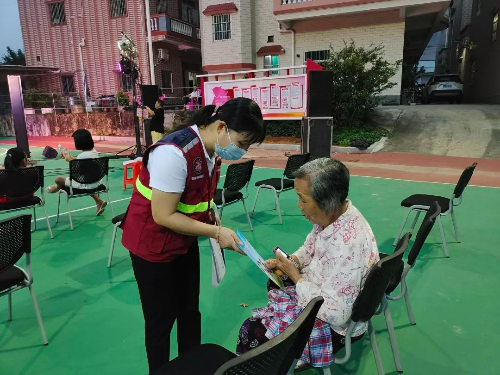 ▲矮岭村政策宣传岗、网格员胡钻卿为年迈群众宣传反诈知识