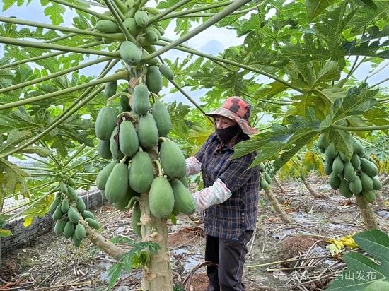 10月末,在鹤山市宅梧镇榴花坪村,农户余大姐的木瓜种植基地一派丰收景象,一串串饱满的木瓜从树干基部一直挂到梢头,空气中弥漫着清甜的果香。