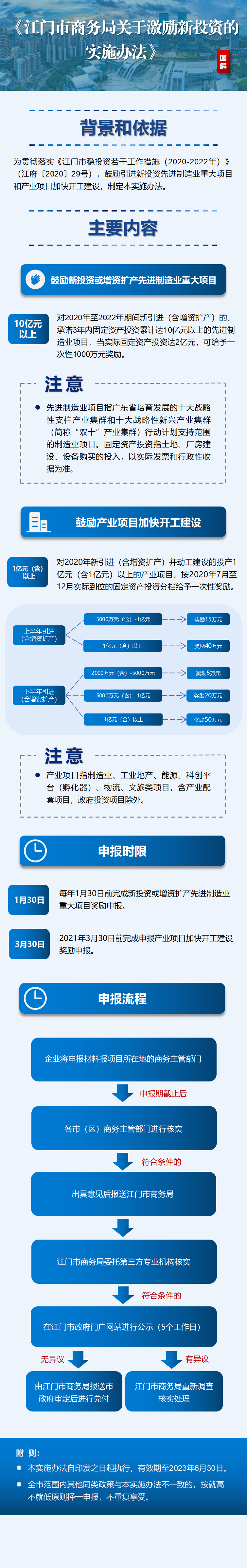 为落实《江门市稳投资若干工作措施(2020—2022年)》(江府〔2020〕29号),鼓励引进新投资先进制造业重大项目和产业项目加快开工建设,江门市商务局制定了《江门市商务局关于激励新投资的实施办法》。