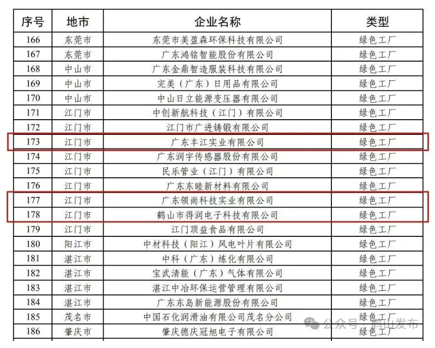 鹤山市得润电子科技有限公司是从事电子连接器、光电连接器、汽车连接器、柔性线路板等电子元器件研发、制造、销售和咨询的国家高新技术企业。广东丰江实业有限公司主要从事密封型免维护铅酸畜电池和胶体畜电池的生产。广东领尚科技实业有限公司致力于橱柜、收纳柜制造。 近年来,鹤山市落实国家、省、市关于绿色工厂培育的决策部署,实施制造业当家“一把手”工程,构建符合鹤山实际的现代化产业体系。支持企业开展工业设计,运用技术改造、数字化转型提升市场竞争力和附加值。绿色工厂将进一步完善绿色制造和服务体系建设,发挥其在制造业绿色低碳转型中的基础性和导向性作用,打造绿色制造领军力量。