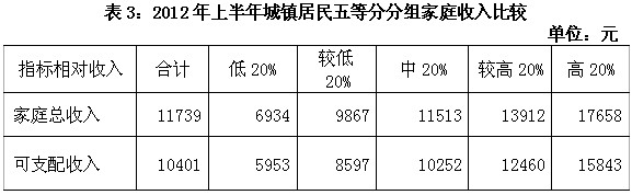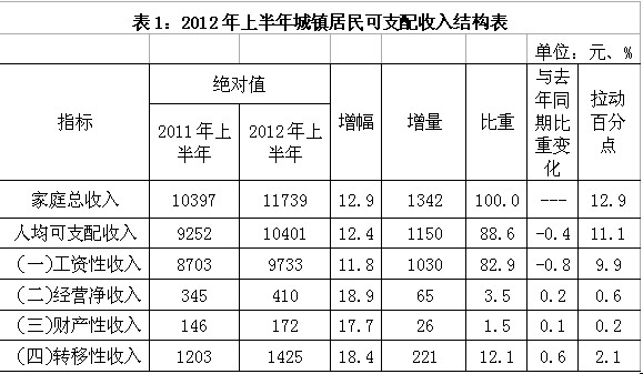 调查资料显示:2012年上半年,城镇居民家庭人均总收入为11739元,同比增长12.9%。其中,人均可支配收入为10401元,同比增长12.4%。(附表1)