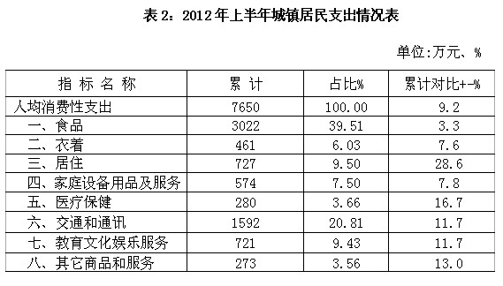 2012年上半年,城镇居民家庭人均消费支出7650元,同比增长9.2%。从消费结构来看,八大类消费支出呈现全面上升态势。(附表2)