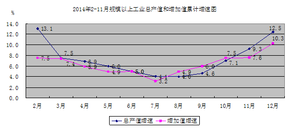 2014年鹤山市规模以上工业产值、增加值增速一直处于低位增长的态势,呈现“开局平稳-逐步下行-稍有回升”的态势,增长速度在7月份探底,下半年逐步小幅度回升。全年实现规模以上工业总产值473.00亿元,增长12.5%;规模以上工业增加值112.05亿元,增长10.3%,增速在江门地区排名第4。(附图1)