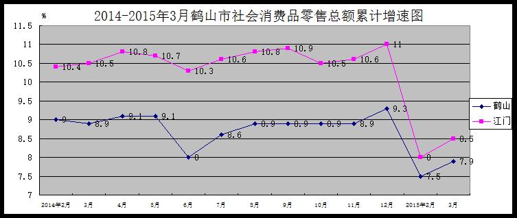 1-3月鹤山市社会消费品零售总额30.80亿元,增长7.9%,增速比去年同期下跌1个百分点。按行业分:贸易批发业增长9.9%;贸易零售业增长7.1%;住宿业下降2.9%;餐饮业增长10.6%。