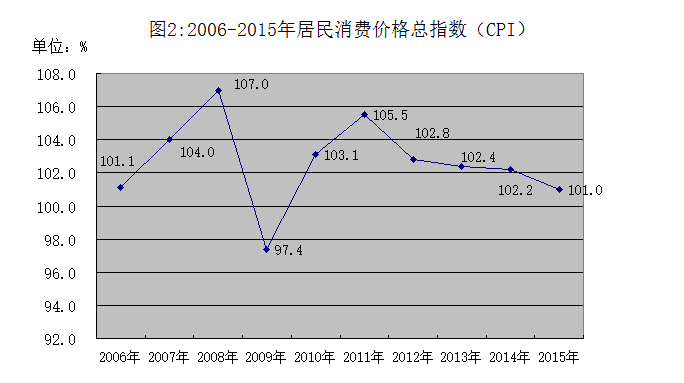 全年居民消费价格总指数为101.0,上涨1.0%。 分类别看,食品类价格上涨4.8%,烟酒类价格上涨1.0%,衣着类上涨1.6%,家庭设备用品及维修服务类上涨1.2%,医疗保健和个人用品上涨0.5%,交通及通信下降3.7%,娱乐教育文化用品及服务下降0.2%,居住类下降3.5%。