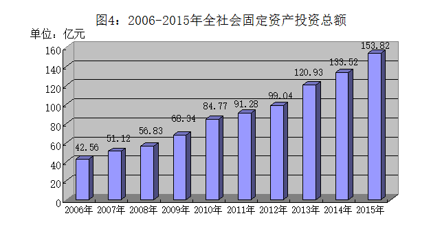2015年固定资产投资153.82亿元,增长15.2%。按投资结构分,基础设施投资27.13亿元,增长0.5%;房地产投资53.67亿元,增长6.1%;其他投资73.02亿元,增长30.6%;。按产业分,第一产业投资1.95亿元;第二产业投资63.41亿元,增长28.8%,其中制造业投资58.97亿元,增长38.0%;第三产业投资88.47亿元,同比增长6.7%。