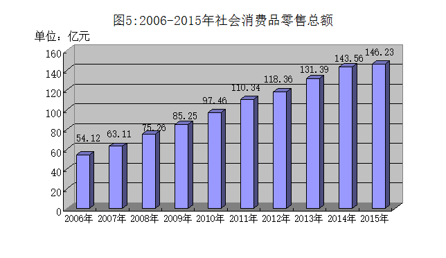 2015年全市实现社会消费品零售总额146.23亿元,增长11.2%。按行业分,贸易批发业零售额12.60亿元,增长13.3%;贸易零售业109.80亿元,增长10.2%,以上两者占全市社会消费品零售总额的83.7%;住宿业零售额0.66亿元,增长9.0%;餐饮业零售额23.18亿元,增长11.6%。