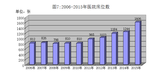 全市有医院、卫生院15间;卫生机构床位1606张,其中等级医院床位1250张;卫生机构人员数2473人,卫生技术人员有1901人,其中:执业医师625人,执业助理医师113人,注册护士847人,药剂人员205人,检验人员111人。全市卫生站137个,卫生站总人数198人。