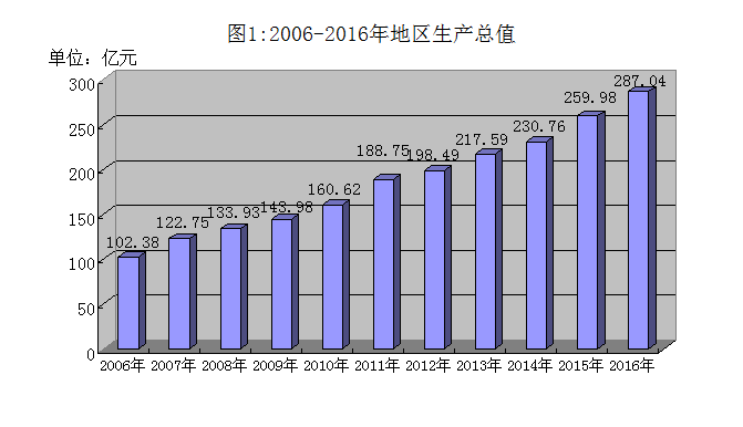 数据显示,2016年全市地区生产总值287.04亿元,增长8.2%。分产业看,第一产业增加值22.21亿元,增长3.0%;第二产业增加值149.61亿元,增长7.1%;第三产业增加值115.22亿元,增长10.8%。三大产业的比例是7.74:52.12:40.14。人均地区生产总值56969元,增长7.8%。全社会用电量为32.72亿千瓦时,增长7.7%,其中城镇居民用电18162万千瓦时,增长8.6%,农村居民用电18324万千瓦时,增长7.0%。