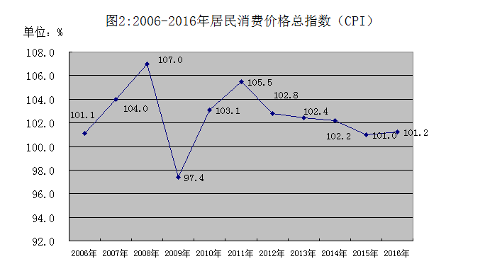 全年居民消费价格总指数为101.2,上涨1.2%。分类别看,食品烟酒类价格上涨3.5%,衣着类上涨1.0%,居住类下降0.3%,生活用品及服务类上涨0.2%,交通和通信类下降1.6%,教育文化及娱乐上涨0.3%,医疗保健上涨0.1%,其他用品和服务上涨5.4%。