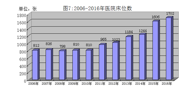 全市有医院、卫生院15间;卫生机构床位1702张,卫生机构人员数2947人,卫生技术人员有1983人,其中:执业医师633人,执业助理医师128人,注册护士944人,药剂人员215人,检验人员119人。全市卫生站149个,卫生站总人数208人。