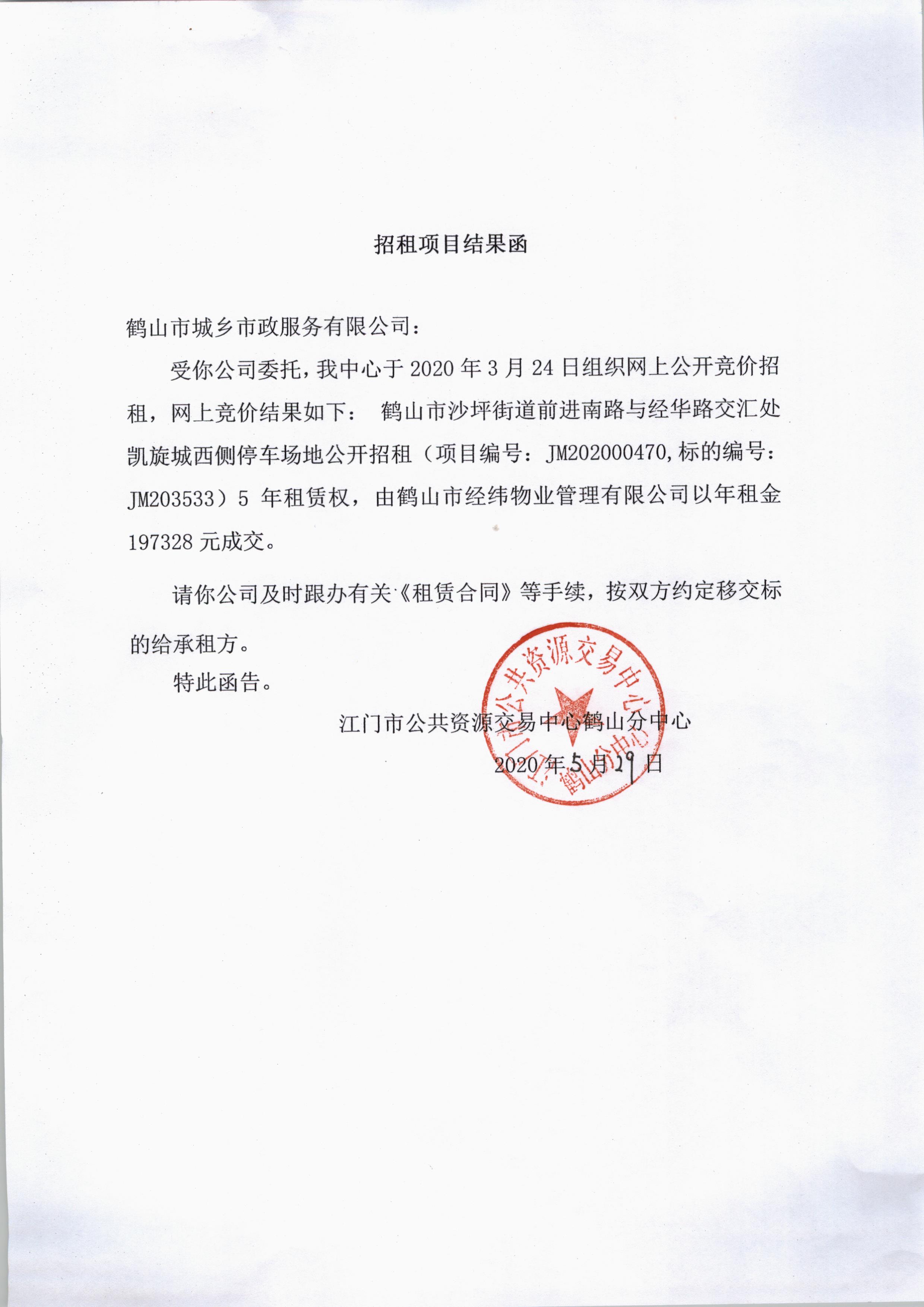 根据鹤山市委、市政府的工作部署及创文督导精神,为解决鹤山城区停车难等相关问题,我司负责鹤山市沙坪街道前进南路与经华路交汇处凯旋城西侧停车场的场地租赁及相关事宜,并在2020年5月,委托江门市公共资源交易中心鹤山分中心,在电子交易平台进行公开招投标;2020年5月29日由鹤山市经纬物业管理有限公司竞得该位置的使用权;2020年6月1日与我司签订租赁合同。具体收费时间另行通知。