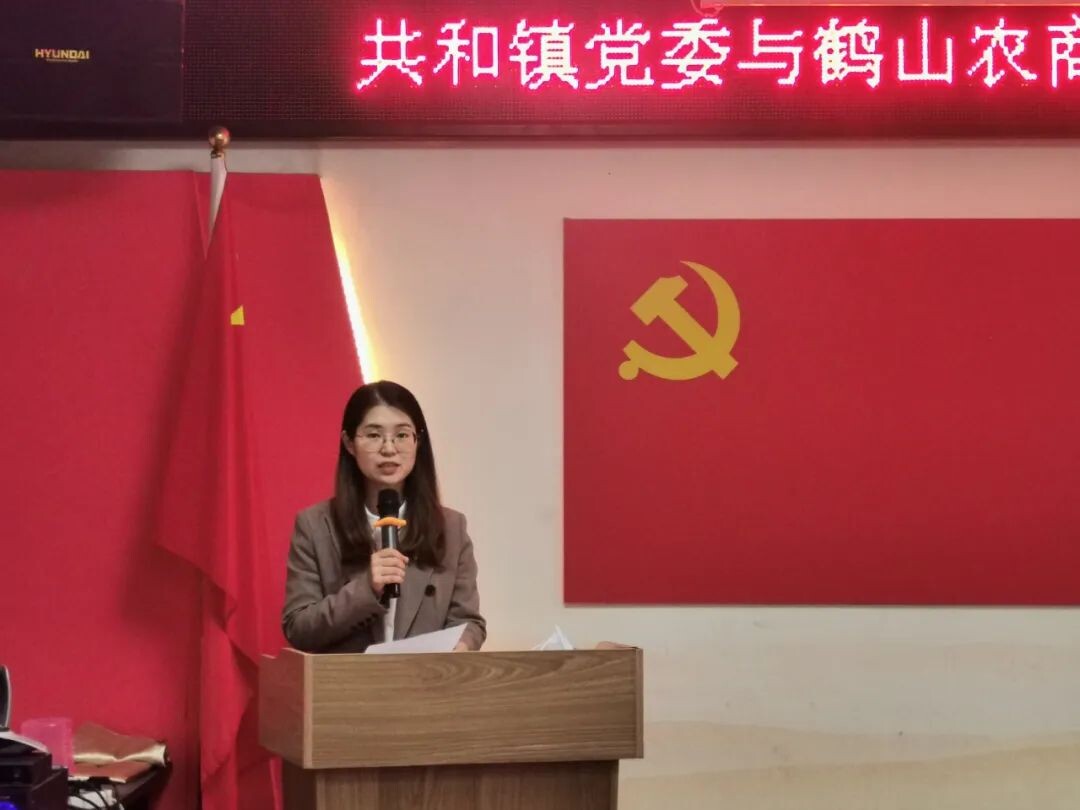 共和镇党委副书记苏婧、鹤山农商银行党委书记石学周代表双方发言并进行签约仪式。镇党委委员梁广祥、鹤山农商银行共和科技支行党支部书记李健文和各村(社区)党组织书记参加了签约仪式。