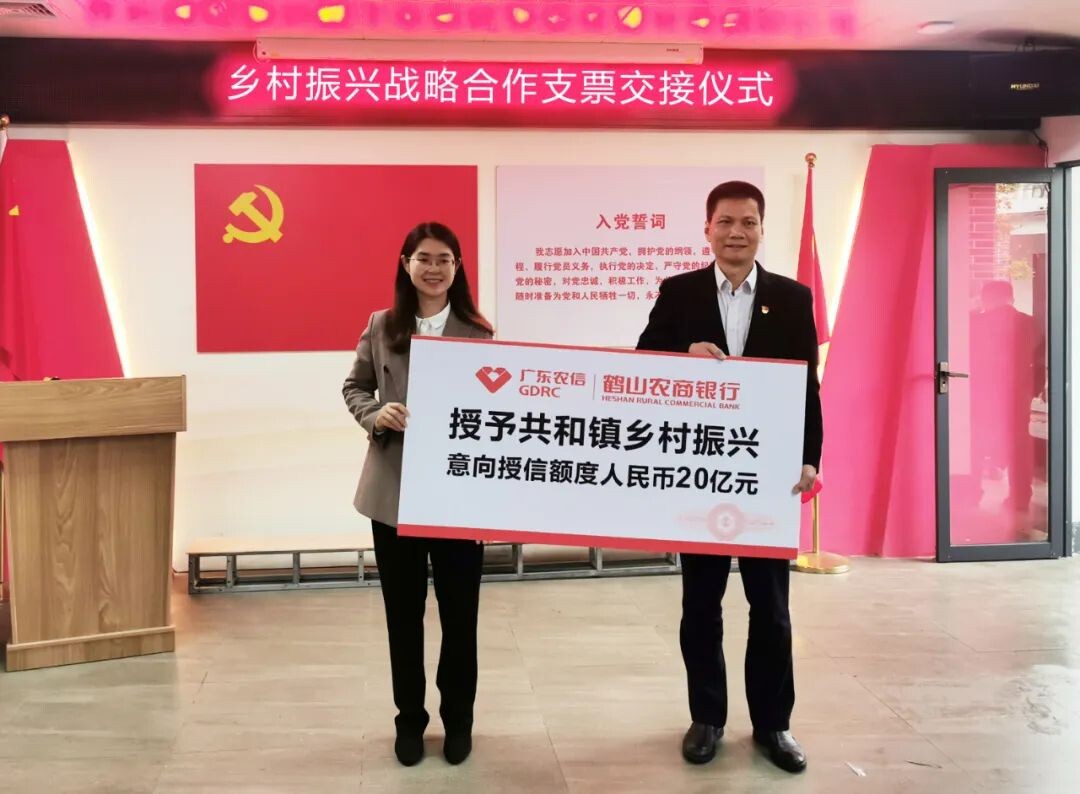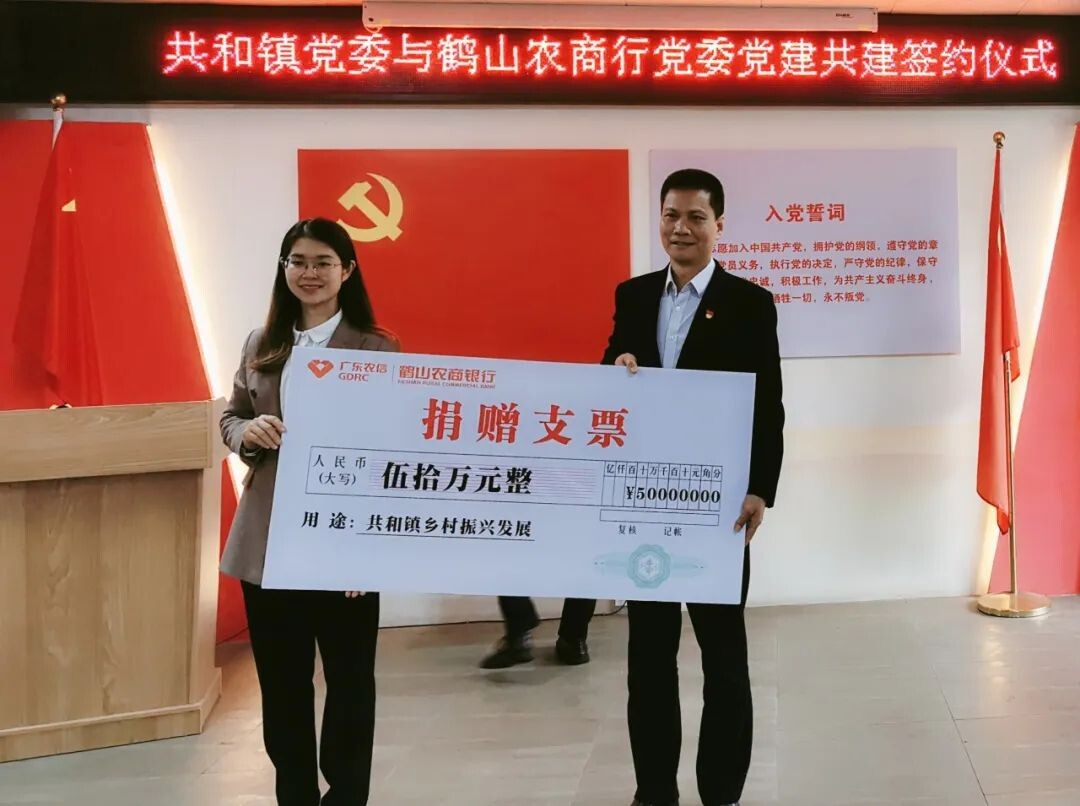 签约仪式后,鹤山农商行党委向共和镇捐赠50万元支票助力乡村振兴,并向共和镇授予20亿元乡村振兴意向授信支票。