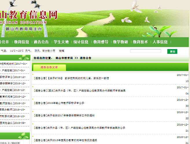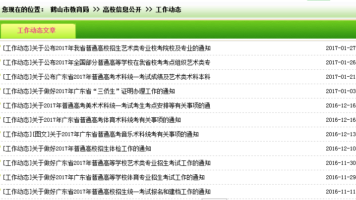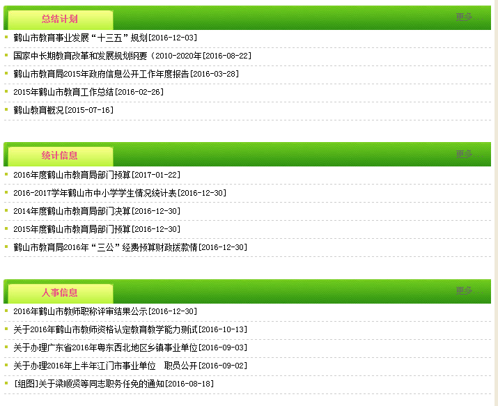 2016年,我局在本局门户网站(鹤山教育信息网)上公开国家政策法规,省相关教育文件、鹤山市教育政策文件,公开重点领域信息、高校信息、省内教育信息和鹤山市教育系统教育信息等,群众可通过查询、表格下载等各类教育信息共2650多条。其中在市政府信息公开门户网站公开教育文件和信息共98条。这些信息包括政务信息、人事信息、招生考试信息、业务类信息、文件类信息和活动类信息等。如《2016年教师招聘公告》、《关于2016年鹤山市小升初工作指引的通知》、《关于印发鹤山市2016年秋季中小学招生计划的通知》、《2016 年度鹤山市教育局部门预算》、《关于外县(市、区)户籍在鹤山任教原民办代课教师审核结果的公示》等信息,所公开的内容及时准确。
