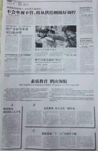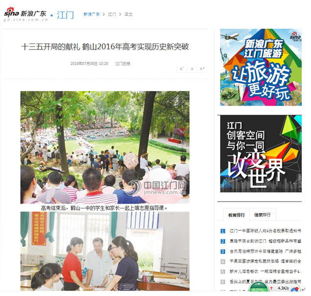 2016年,《南方日报》专题报道了《鹤山教育素质领航》的文章,公开了我市2016年中高考取得的成绩。我局联合《江门日报》公开教育文件和信息共89次,其中公开生本教育实验信息28次,高考信息5次,鹤山教育发展情况5次,学校特色建设和校园文化建设信息5次,行业先进人物信息6次,其他信息46次。