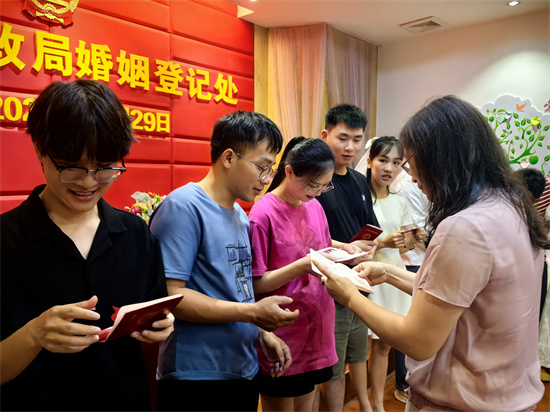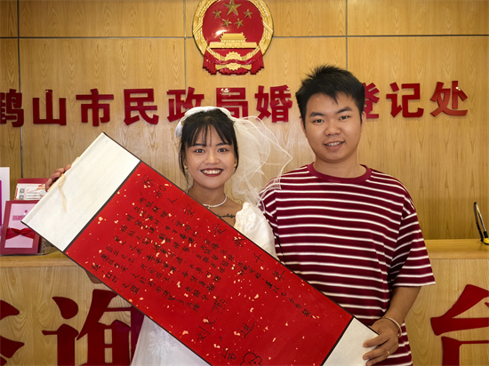 上午10时,20对新人在登记大厅集体宣誓结为夫妻,市民政局副局长李敏英为新人颁证并赠送礼物,寄语新人“以誓言为舟,以包容作桨,共筑幸福港湾”。