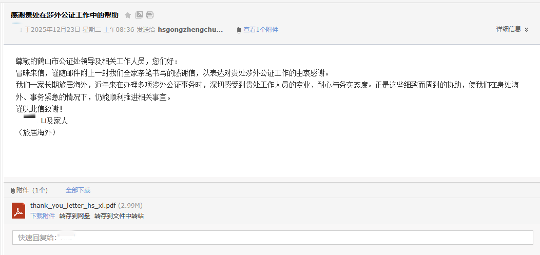 旅居海外的李女士一家,在办理房产买卖委托、未成年人单独出入境等公证事项时,面临信息不畅、时间紧迫、手续繁杂等实际困难,市公证处副主任黄务寅获悉情况后,主动靠前服务,通过提前沟通、精细指导、材料预审、协调国内亲属代办等方式,确保李女士一家在极短的时间内顺利完成相关手续。考虑到海外接收文件的时效性,黄主任还积极协助安排国际寄递,确保公证文书及时送达,助力未成年人平安顺利通关。近日,市公证处收到一封来自海外华人家庭的《感谢信》,字里行间讲述了他们在办理公证业务时,收获的专业指导与跨域协助,生动彰显了市公证处在涉外法律服务领域的责任与情怀。