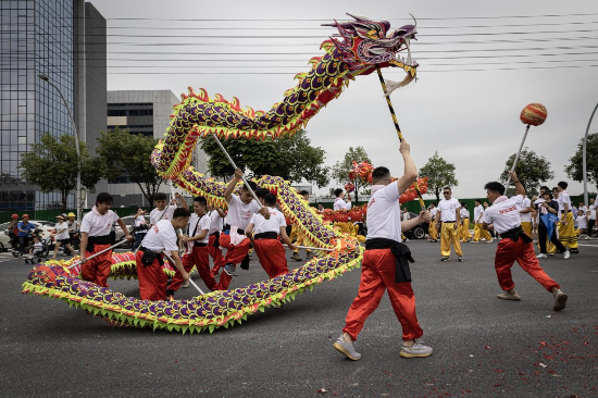 下午12时,巡游活动正式开始,来自仓边、玉桥、莺朗、桥氹四条村的村民以及各地的易氏子孙组成巡游队伍,从玉桥小学按顺序出发,巡游队伍在罗伞、旗海开路下,浩浩荡荡,络绎不绝,令人目不暇接。金龙在空中翻腾飞舞,醒狮舞动跳跃,少年们装扮成威武的战士,少女们则穿着传统服装挑着花篮宛如仙女下凡,各式巡游方阵轮番上演精彩表演,引来阵阵喝彩,市民游客纷纷举起手机拍照。