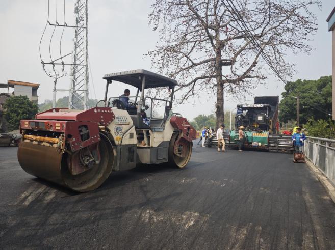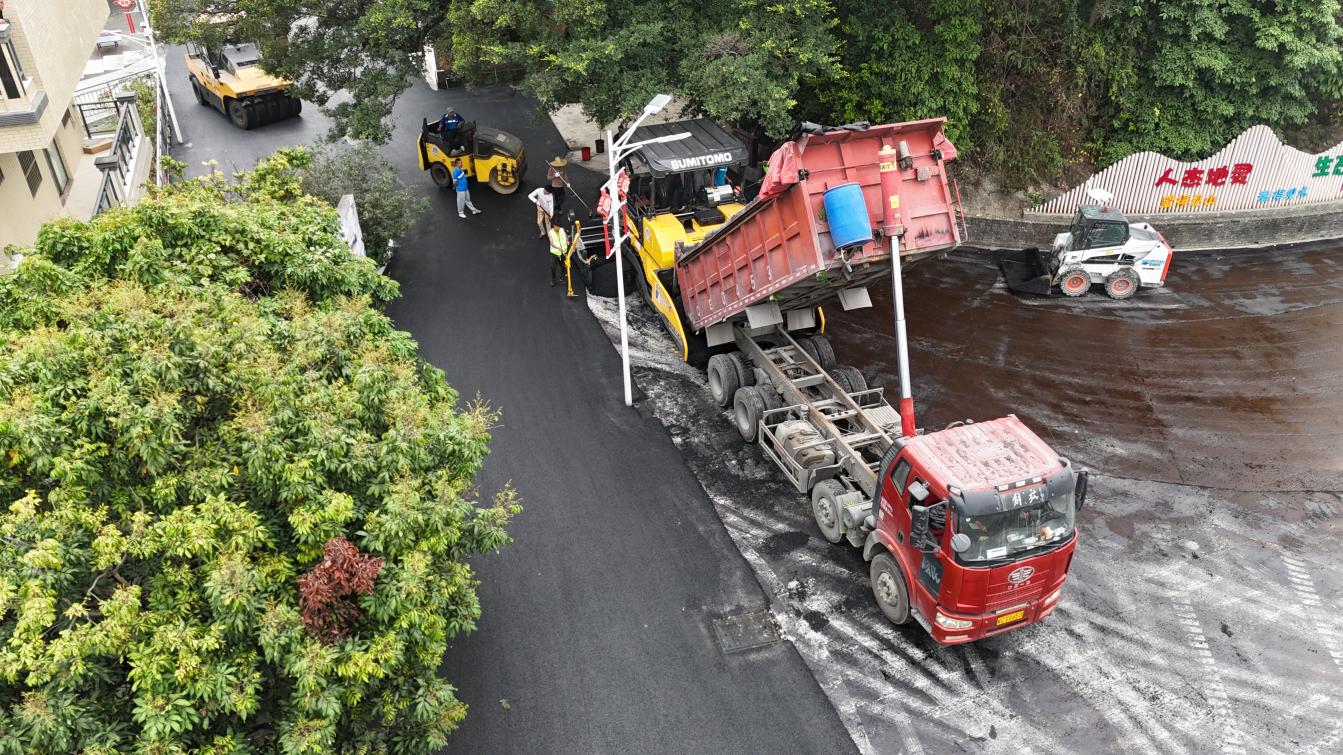 连日来,多台机器高效运转,施工紧锣密鼓。现场,摊铺机匀速前行,将滚烫的沥青均匀地铺在道路上,压路机紧随其后,确保沥青路面的平整度和密实度。作业人员紧密协作,时刻关注着沥青的摊铺情况,确保厚度均匀。