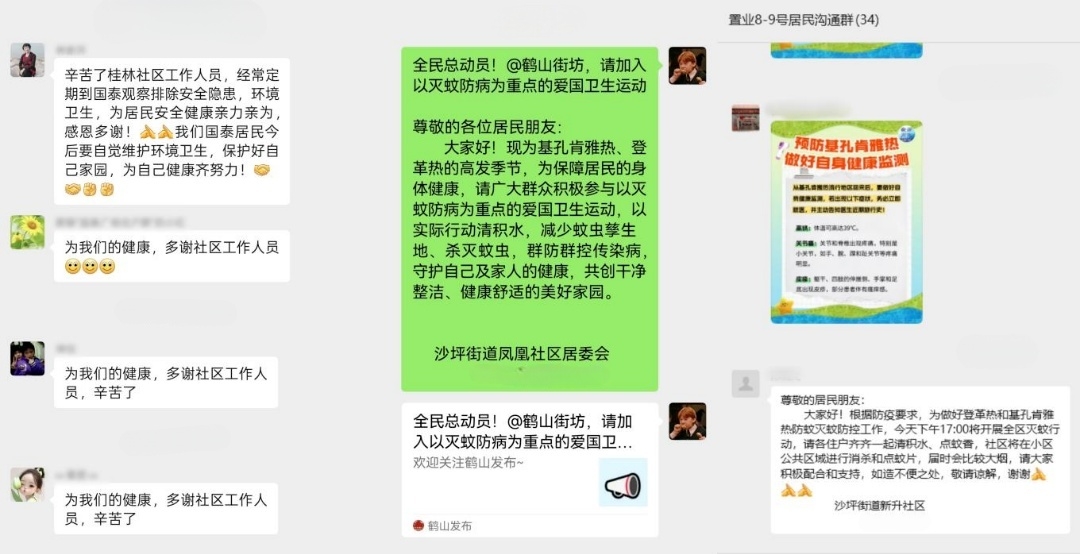 同时,通过业主群、楼栋群、村民群等发送有关知识,线上阵地常态化发声,重点面对跨市通勤人员、老年人、儿童等群体,积极发动全民参与防蚊灭蚊,让蚊媒防疫信息“触手可及”。