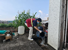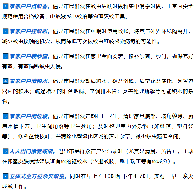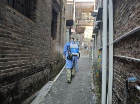 组织消防、网格等精干力量组建约250人专职消杀突击队,使用超低容量喷雾器、常量喷雾器及热烟雾机按照适用场景定时作业。党员义工深入房前屋后、庭院阳台、楼顶天台等各个角落,“地毯式”清理各类积水容器;“拉网式”集中排查整治,深入清理闲置物、闲置地、背街冷巷、楼顶天台等卫生黑点;“立体式”宣传动员,入户检查清理室内积水,通过宣传单张、移动广播、面对面宣讲等方式普及“七天七招工作法”和“1310”防蚊要诀。9月14日,累计出动约2000人次,派发宣传资料超1万份,清理垃圾约42吨,清理孳生地296处,清理积水2729处。