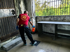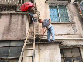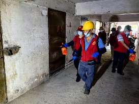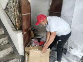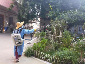 ▲社区志愿楼长使用自制喷壶对单车房等阴暗角落进行喷洒