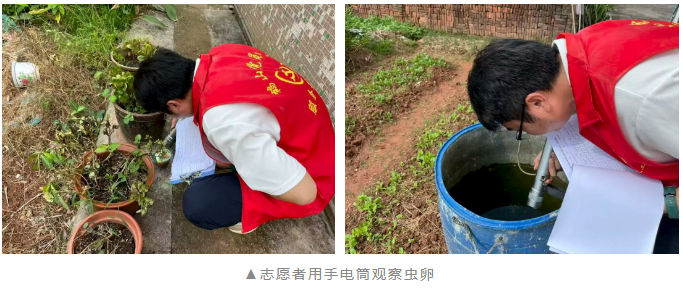 针对居民对清理家中水培植物的不理解,志愿者现场用手电筒辅助观察,让虫卵无处遁形,使群众心服口服,从“要我清”转为“我要清”。