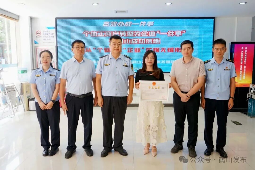 鹤山市市场监督管理局、鹤山市政务服务和数据管理局联合税务、人社、住建、公安等部门,依托“个转企一件事”服务专区,将“注销+开办”两段式流程整合为“直接变更”单一流程,实现“一表申请、一次提交、一窗受理、一网通办”。办事环节从6个精简至1个,申报材料减少50%,最快当天领取新执照。