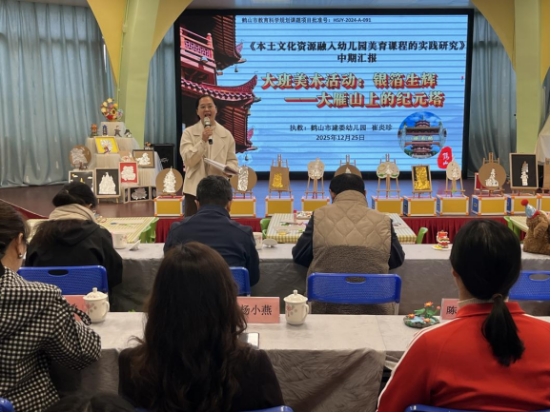 共建的温暖,既体现于物质支持,更蕴含在专业的同行与智慧的共享。捐赠仪式后,《本土文化资源融入幼儿园美育课程的实践研究》课题进行了中期汇报。何艳银副园长系统阐述了课题进展情况和阶段性成果,崔炎珍老师则现场展示了大班美术活动《银箔生辉——大雁山上的纪元塔》,孩子们以银箔创作表达对本土文化的感知,展现了美育与文化融合的生动实践。