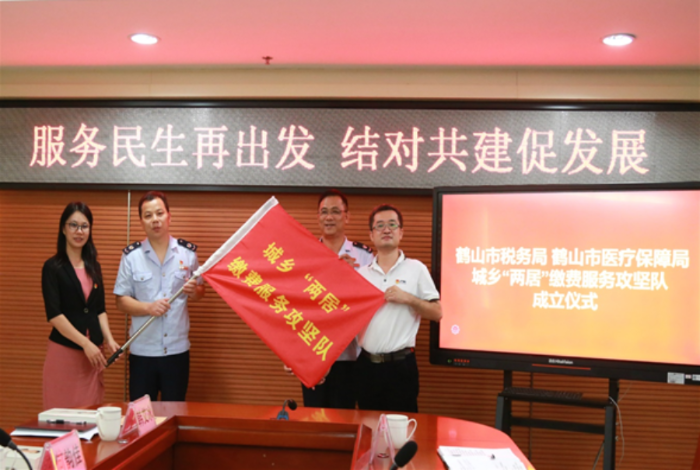 最后,市医保局党组书记、局长吴小清,市税务局党委书记、局长张先林共同为城乡“两居”缴费服务攻坚队授旗,宣布市医保局党支部与市税务局机关第四党支部结对共建正式启动。