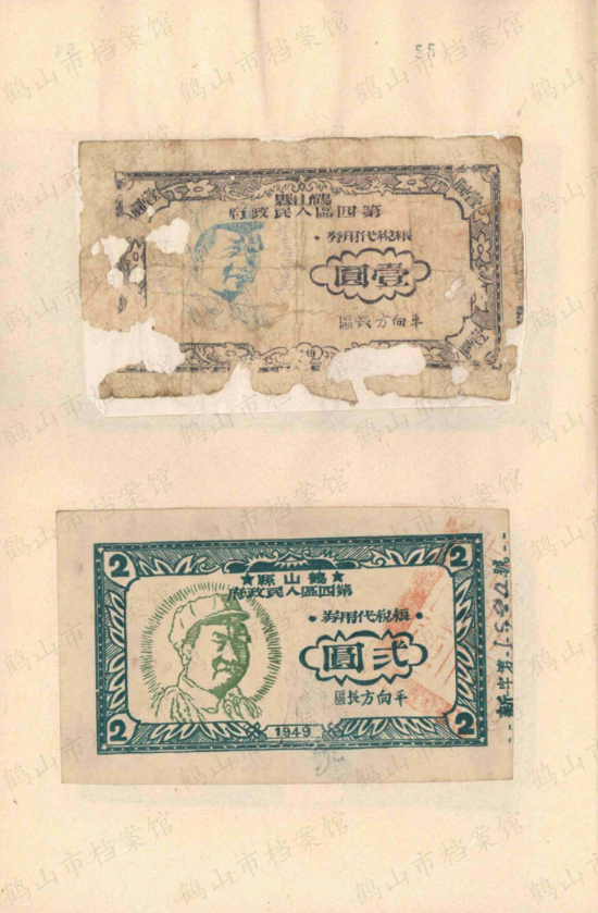 鹤山粮税代用券现藏于鹤山市档案馆,小小纸券背后是不见硝烟的战场,曾背负着重大的历史使命。上世纪三、四十年代,国民党政府罔顾经济和民生,滥发货币,导致物价飞涨、民不聊生。据馆藏资料记载,为对抗通货膨胀,冲破敌人经济封锁,活跃农村经济,巩固革命政权,1949年,中共高鹤地工委经上级党组织同意,由鹤山县第四区人民政府发行“粮税代用券”,可以在市场流通。此代用券很受群众信任,在鹤山、高明一带广为流通,成功抵制了国民党政府的经济剥削,在一定程度上起到了活跃市场、疏通贸易、稳定金融的作用。