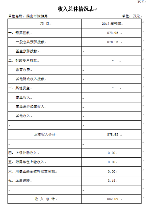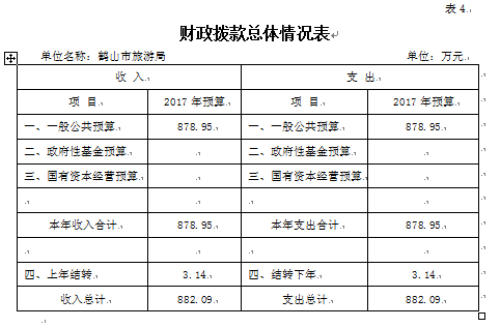 旅游局2017年财政拨款收支总预算882.09万元。收入包括:一般公共预算拨款本年收入878.95万元,上年结转3.14万元。支出包括:社会保障和就业(类)支出34.55万元、医疗卫生与计划生育(类)支出7.37万元、商业服务业等(类)支出822.31万元、住房保障(类)支出14.72万元、结转下年3.14万元。