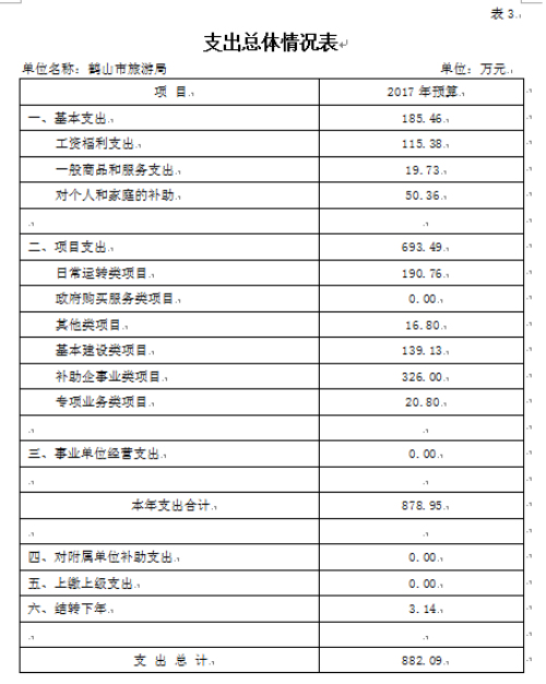 旅游局2017年支出预算882.09万元,其中:基本支出185.46万元,占21.03%;项目支出693.49万元,占78.62%,结转下年3.14万元,占0.36%。