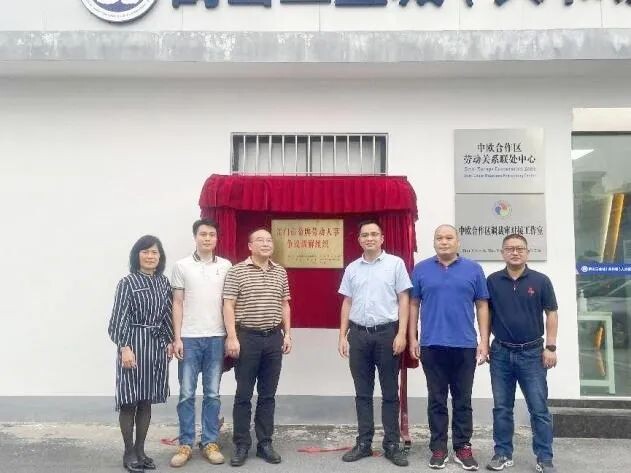 11月15日下午,江门市总工会党组成员、三级调研员熊庆平、鹤山市人社局副局长黄泽中、总工会副主席吕丽群等同志到共和镇中欧(江门)合作区劳动关系联处中心参与揭牌仪式,鹤山工业城党工委副书记雷铭同志、鹤山工业城党工委委员、管委会副主任冯锦强同志一同参与揭牌。
