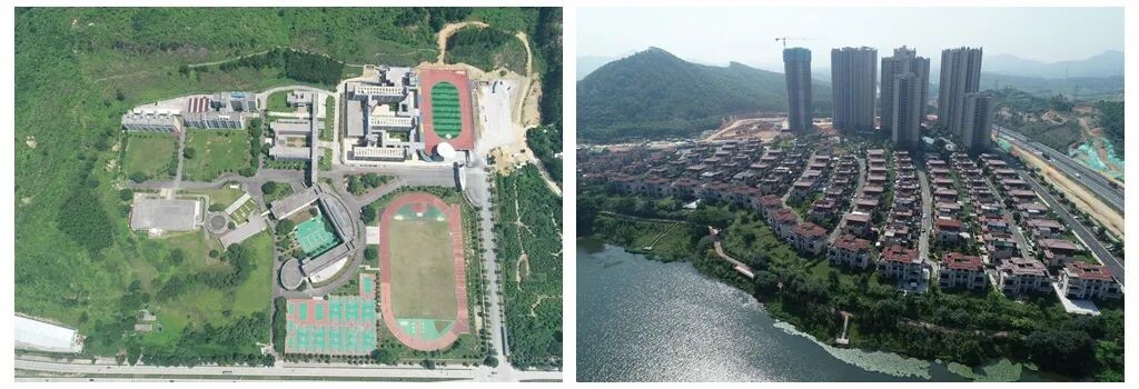 【左:共和中学俯瞰图;右:碧桂园-天麓湖小区俯瞰图】