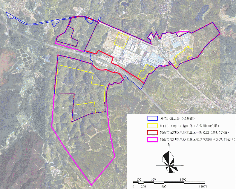 江门市(鹤山)精细化工产业园位于鹤山市龙口镇凤沙工业区内,属于“区中园”。根据原批复文件,龙口镇凤沙工业区规划地段东至云顶岗村周边小山丘,南抵江肇高速,西临凤沙大道西侧规划支路,规划总面积112.32公顷,其中,北至在建泰汇环保围墙外山体,东至云顶岗村周边小山丘,南抵江肇高速,西至凤沙大道西侧规划支路,规划总面积约70公顷,属于龙口镇危险化学品生产、储存、经营园区用地范围(即江门市(鹤山)精细化工产业园)(来源于《鹤山市危险化学品生产、储存、经营园区规划修改(2017-2035)》及其批文“鹤府复〔2016〕161号”)。
