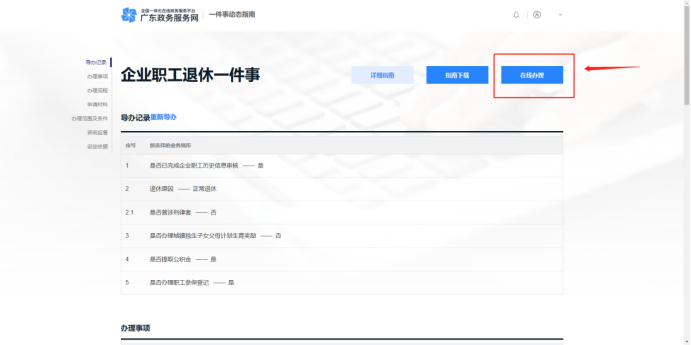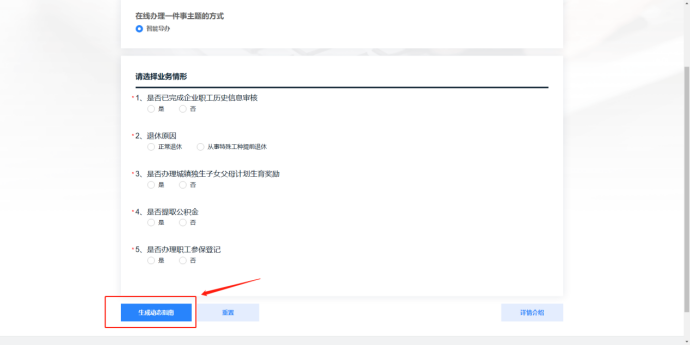 进入智能导办模式,根据个人实际情况,选择相应需要办理的事项,点击【生成动态指南】,确认申请信息之后,点击【在线办理】