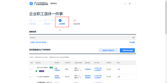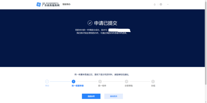 依次完成【信息自检】【填写表单】【上传材料】,系统提示【申请已提交】,完成业务申报。