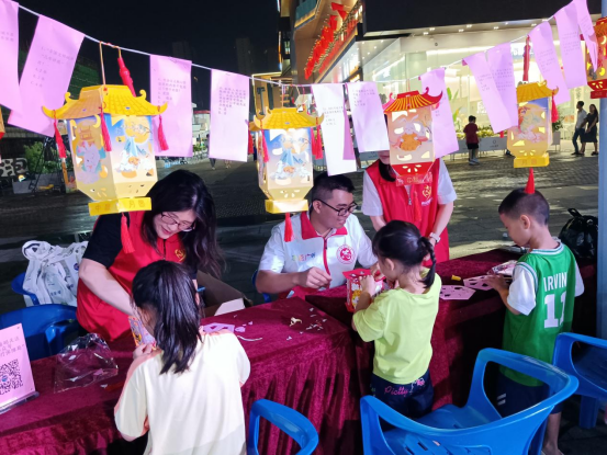 活动中,志愿者们耐心地向现场的孩子们介绍花灯的制作过程,并亲自手把手指导小朋友动手制作,通过折叠、剪裁、粘贴、拼接、组装等一系列过程,一个个漂亮的中秋花灯就从小朋友们手中诞生了。活动现场开展的“猜灯谜•有奖竞猜”活动,同样吸引了众多的群众前来驻足参加,大家拿起灯谜,你一言我一语,一起讨论谜底,开心兑换奖品,现场充满了欢声笑语。