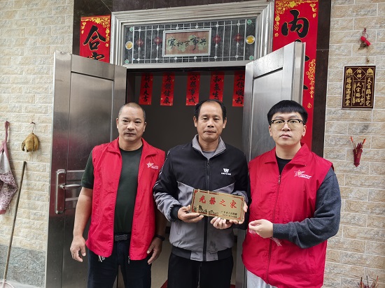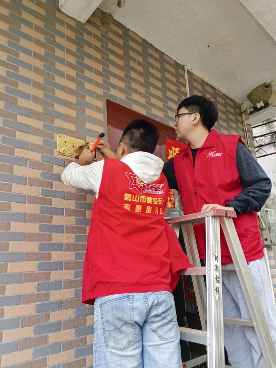 服务站工作人员将光荣牌规范悬挂在现役军人家门的显眼位置,那金黄色的牌子在阳光下熠熠生辉。